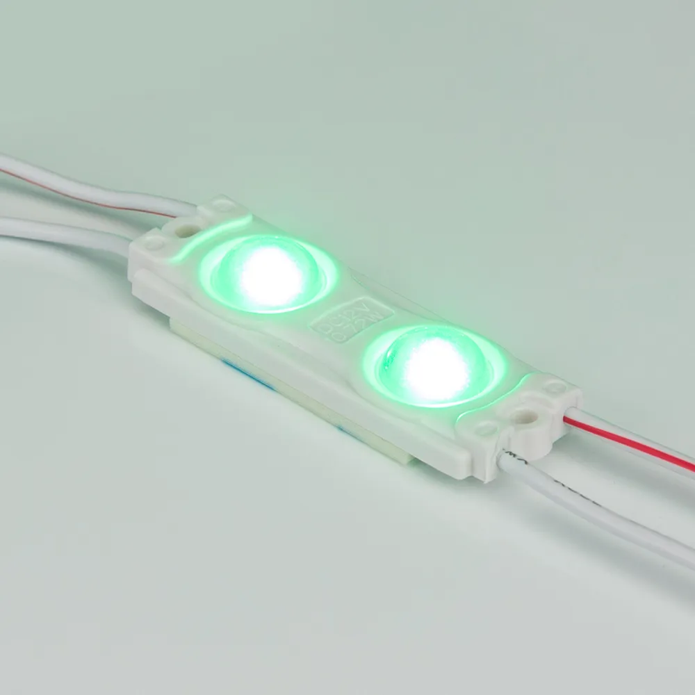 Герметичный светодиодный модуль IP65, ЗЕЛЕНЫЙ 525 нм, напряжение 12 В, мощность 0.72 Вт, св. поток 32 лм, 2 светодиода SMD 2835, угол 160°. 20 шт на проводе, расстояние между центрами модулей 108 мм, длина провода между модулями 60 мм, рекомендуемая глубина установки 60-100 мм. Размер 48x16x5 мм. Гарантия 3 года.