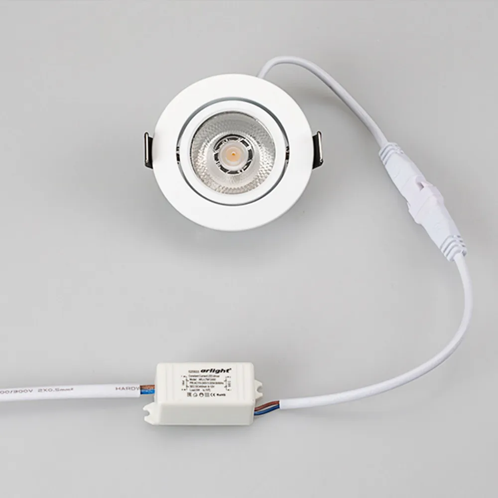 Врезной круглый мебельный светильник 5Вт, корпус белый алюминий. Цвет БЕЛЫЙ 6000K. Светодиод 1х5W Bridgelux. CRI>80, Св.поток 350-400лм, наклоняемая ось, угол 10°. Питание 110-240VAC, 5Вт, 400mA 11-13V, драйвер в комплекте. Размеры d65x20 мм, врезное отверстие d55 мм.
