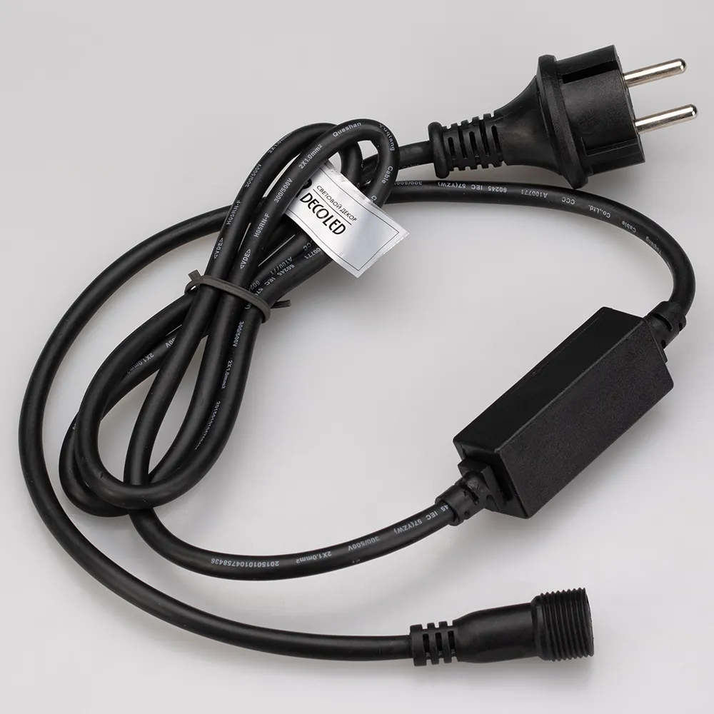Шнур питания для моноцветных светодиодных гирлянд ШАРИКИ, НИТЬ постоянного свечения. Материал оболочки ПВХ. В комплект входит: шнур питания с вилкой европейского стандарта, разъём подключения к гирлянде, выпрямитель AC/DC. Цвет провода чёрный. Длина провода 1.5 метра.