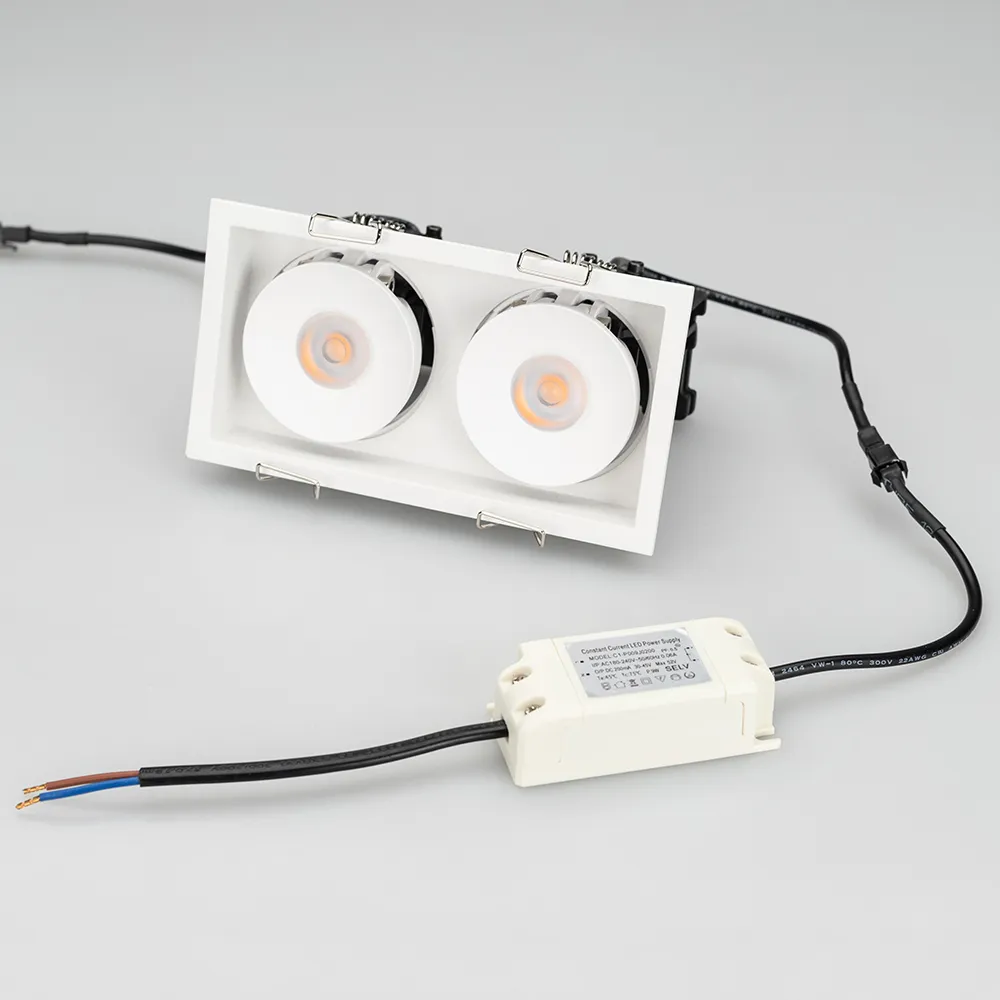 Встраиваемый поворотный светильник для потолка. Мощность 2x9W, цвет ДНЕВНОЙ 4000K, св.поток 1260лм, угол 45°, RA>90. Корпус прямоугольный белый. Питание AC180-240V. Размеры LxWxH 148x80x90мм. Установка в отверстие 140x70мм. Драйвер в комплекте 2 шт (30-45V, 220mA).