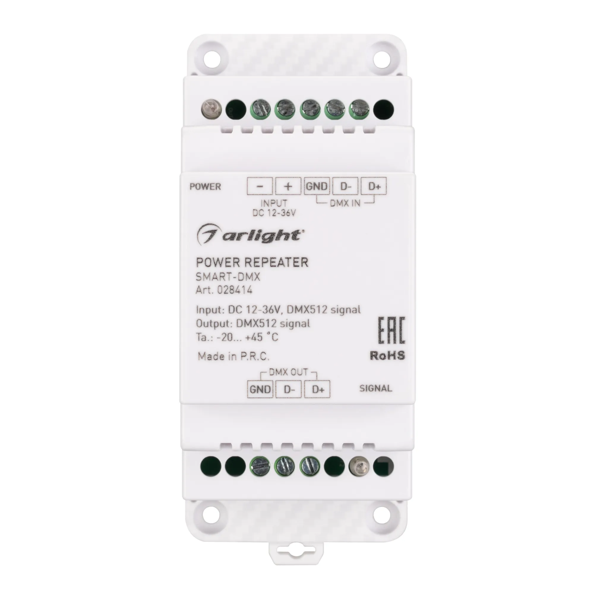 Усилитель сигнала DMX512/RDM. Вход - DMX512, выход 1CHxDMX512, напряжение питания DC 12-36V. Габариты 110х67х48 мм. Для использования на DIN-рейке.