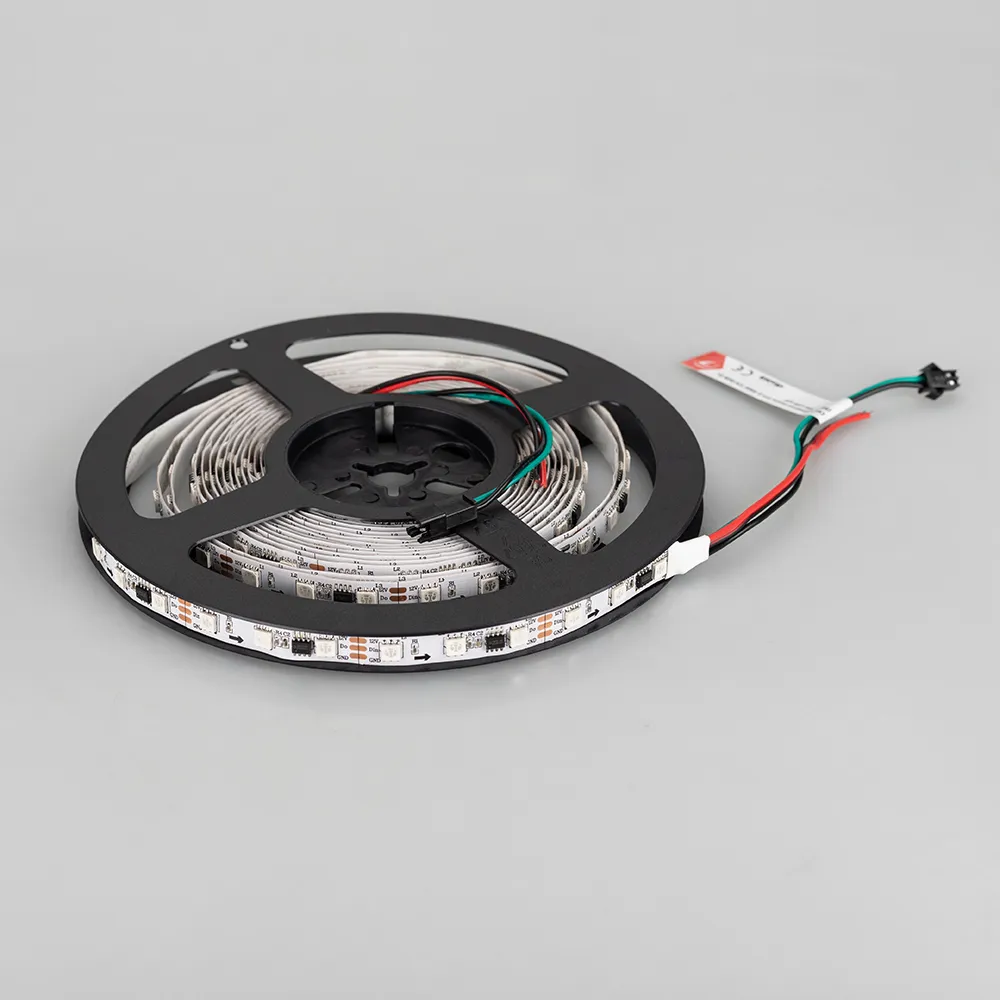 Открытая лента «Бегущие огни» (IP20) с драйвером 16703. Рекоменд-ся подводка пит-я с 2 сторон ленты. Длина 5м, 300шт LED RGB 5060, 20 pixel/m (1 pixel = 3 LED). Управление от внешнего контроллера SPI, без авторежима. Питание 12V, макс. мощн-ть 14,4 Вт/м (статический белый цвет). Ширина 10 мм. Негерметичные прямоугольные коннекторы.