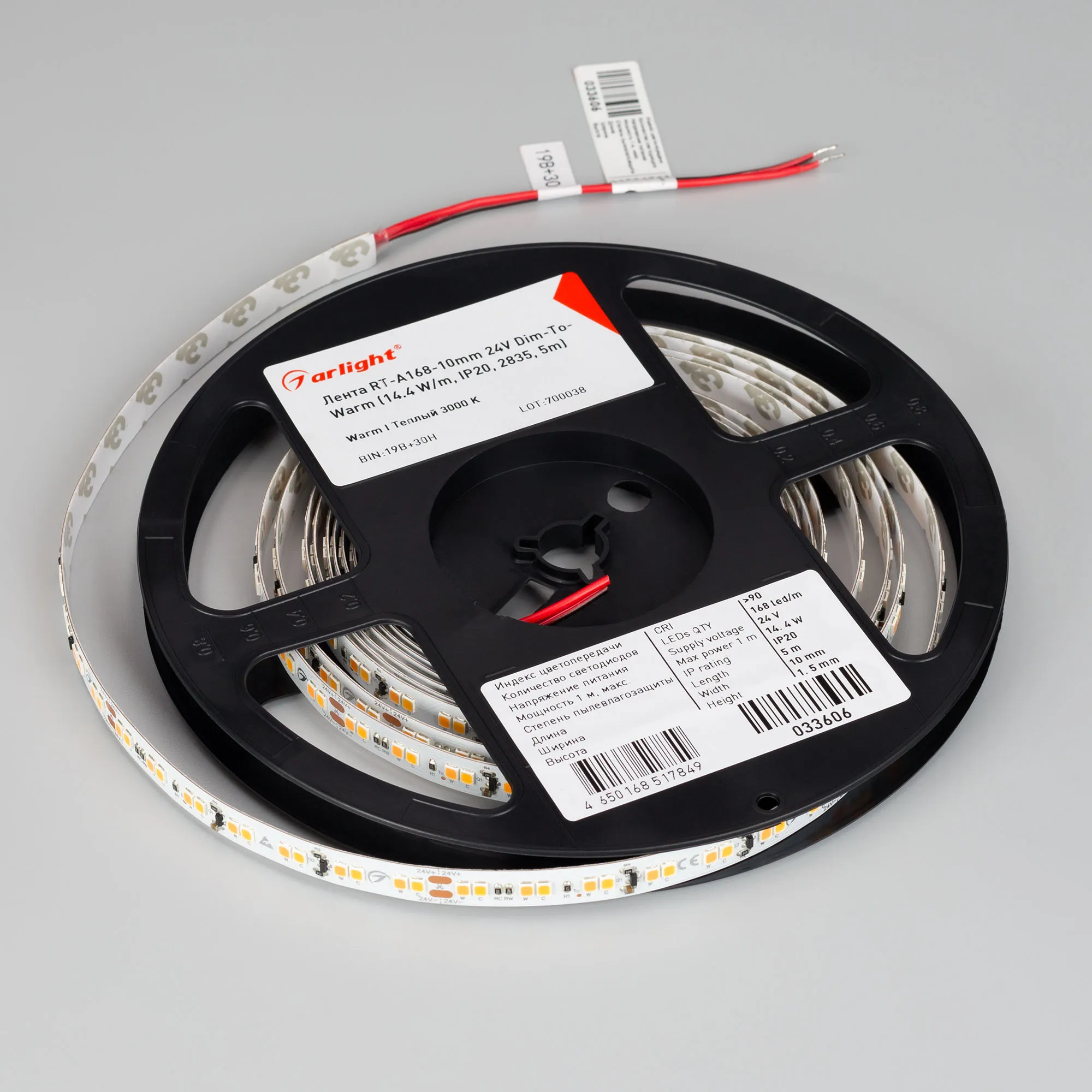 Лента светодиодная RT-A168-10mm 24V Dim-To-Warm (14.4 W/m, IP20, 2835, 5m) (Arlight, Dim-To-Warm)