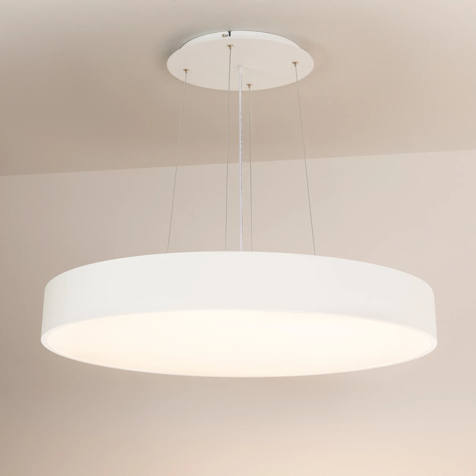 Накладной интерьерный светильник. Мощность 94 Вт, св. поток 8460 лм, 90 лм/Вт, теплый 3000 K, CRI>80, угол 120°, напряжение питания 230 В. Белый круглый корпус из алюминия, степень защиты IP20. Размер: диаметр 800 мм, высота 100 мм. Монтаж накладной. Драйвер 28-42 В, 1200 мА (2 шт.), пульсация <5%.