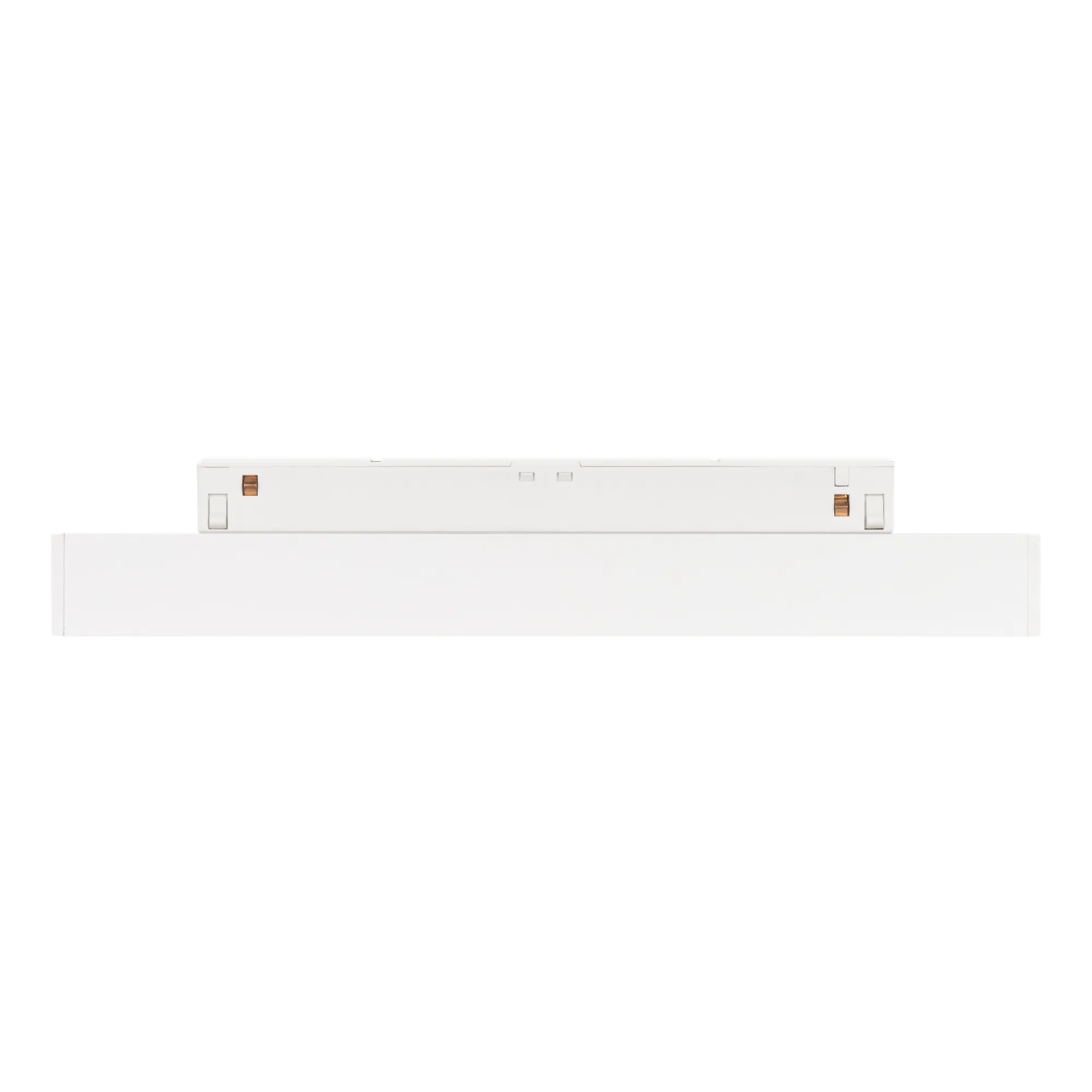 Светильник для магнитных треков MAG-ORIENT шириной 26 мм с управлением DALI. Мощность 8 Вт, св. поток 440 лм, 55 лм/Вт, теплый 3000 K, CRI>90, угол 24°, напряжение питания 48 В. Белый прямоугольный корпус из металл, экран поликарбонат, степень защиты IP20. Размер: длина 235 мм, ширина 22 мм, высота 42 мм. Монтаж на трек MAG-ORIENT. Пульсация <1%.