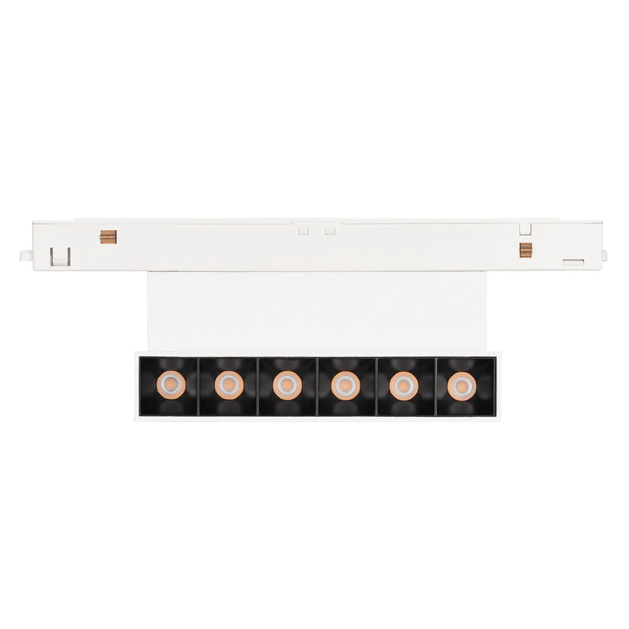 Светильник для магнитных треков MAG-ORIENT шириной 26 мм. Мощность 6 Вт, св. поток 250 лм, 42 лм/Вт, дневной 4000 K, CRI>90, угол 30°, напряжение питания 48 В. Белый прямоугольный корпус из металл, экран поликарбонат, степень защиты IP20. Размер: длина 204 мм, ширина 23 мм, высота 104 мм. Монтаж на трек MAG-ORIENT. Пульсация <1%.