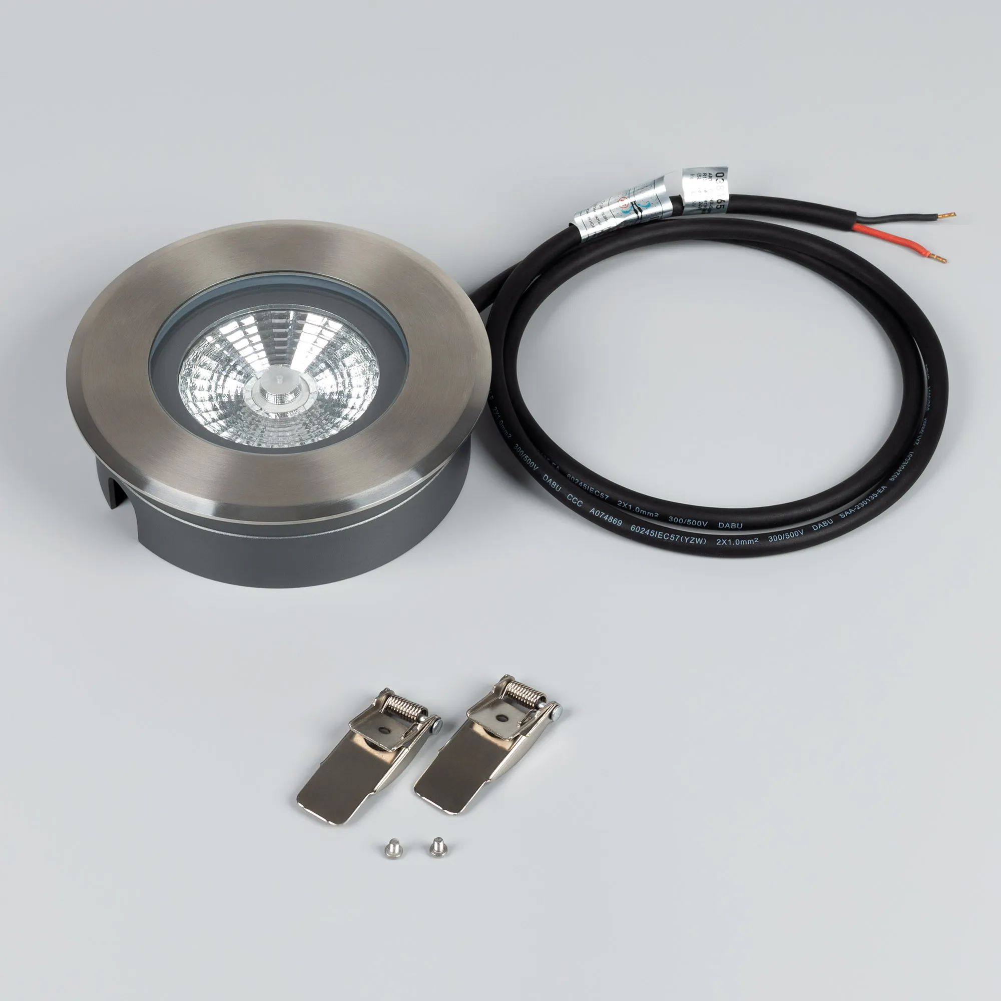 Встраиваемый светодиодный светильник для грунта и пола. Мощность 9Вт, угол освещения 30°, световой поток 475лм, цвет ТЕПЛЫЙ 3000К, CRI(Ra)>80. Круглый влагозащищенный корпус IP67, внешняя рамка из нержавеющей стали AISI 316. Экран закалённое стекло. Питание 24V, 9Вт. Размер Ø130x38мм. Установка в отверстие Ø118x35мм. ВНИМАНИЕ! Светильник не поддерживает регулирование светового потока ШИМ. Комплект установки в грунт/пол в комплекте,