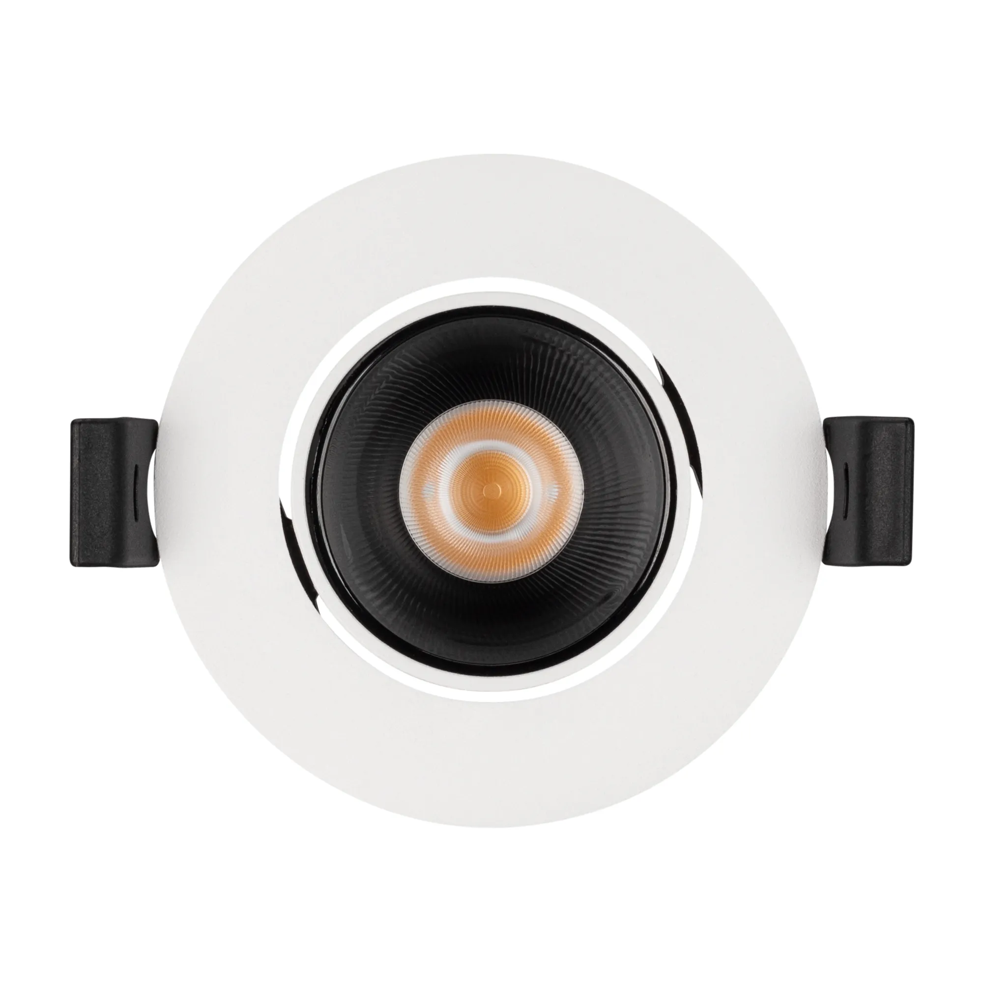 Встраиваемый поворотный светильник даунлайт. Мощность 8.4 Вт, св. поток 682 лм, 79 лм/Вт, теплый 3000 K, CRI>90, UGR<16, угол 32°, напряжение питания 230 В. Белый круглый корпус из алюминия, черный МАТОВЫЙ отражатель из PMMA, степень защиты IP20. Размер: диаметр 82 мм, высота 51 мм. Монтаж встраиваемый, установочное отверстие: диаметр 75 мм. Драйвер 21-42 В, 200 мА, пульсация <2%.
