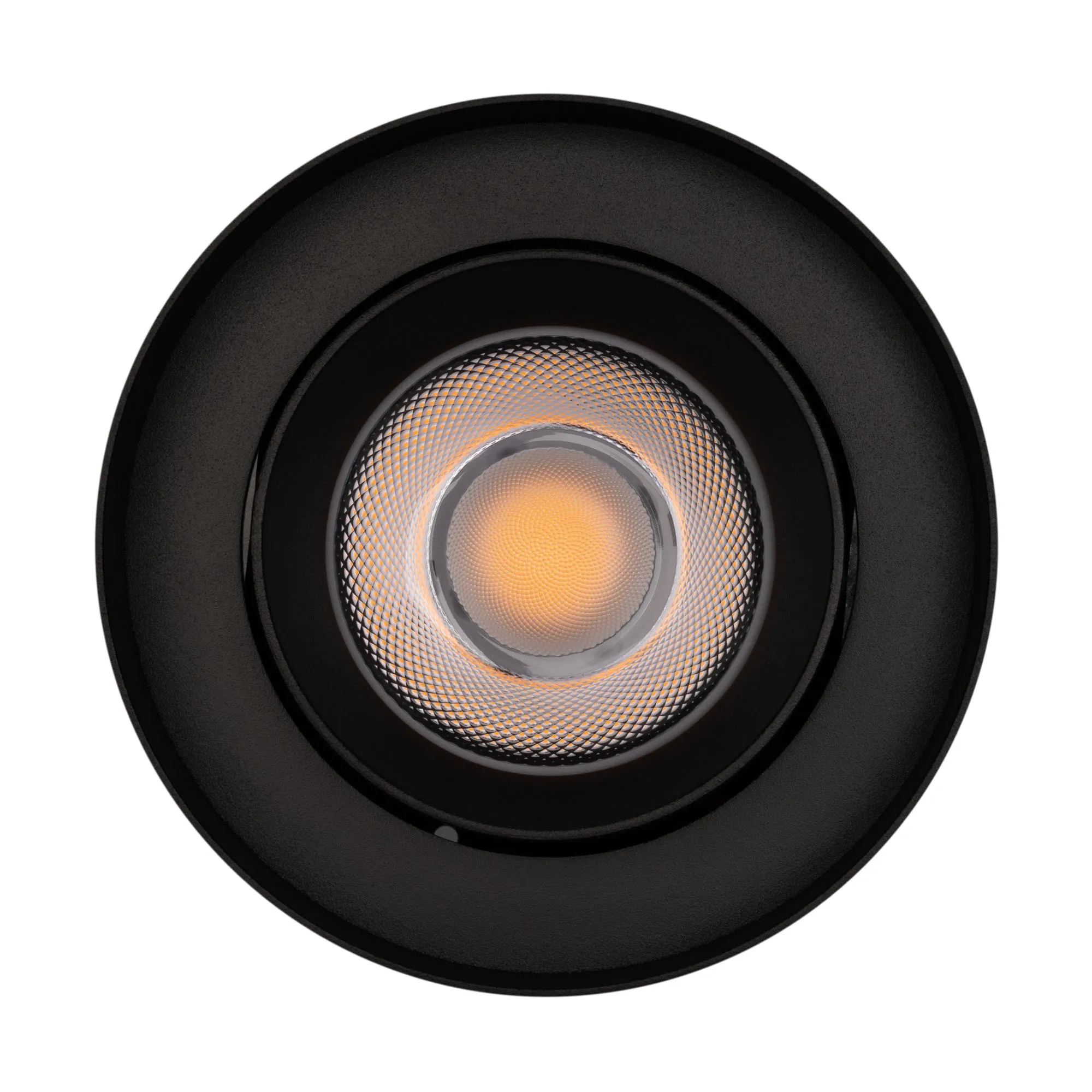 Накладной интерьерный светильник. Мощность 24 Вт, св. поток 2400 лм, 99 лм/Вт, теплый 3000 K, CRI>90, угол 50°, регулируемое направление луча 40°(20+20), поворотный световой модуль вокруг своей оси на 340°, UGR <11, напряжение питания 230 В. Чёрный круглый корпус из алюминия, степень защиты IP54. Размер: диаметр 132 мм, высота 165 мм. Монтаж накладной. Драйвер 27-45 В, 600мА, пульсация <1%.