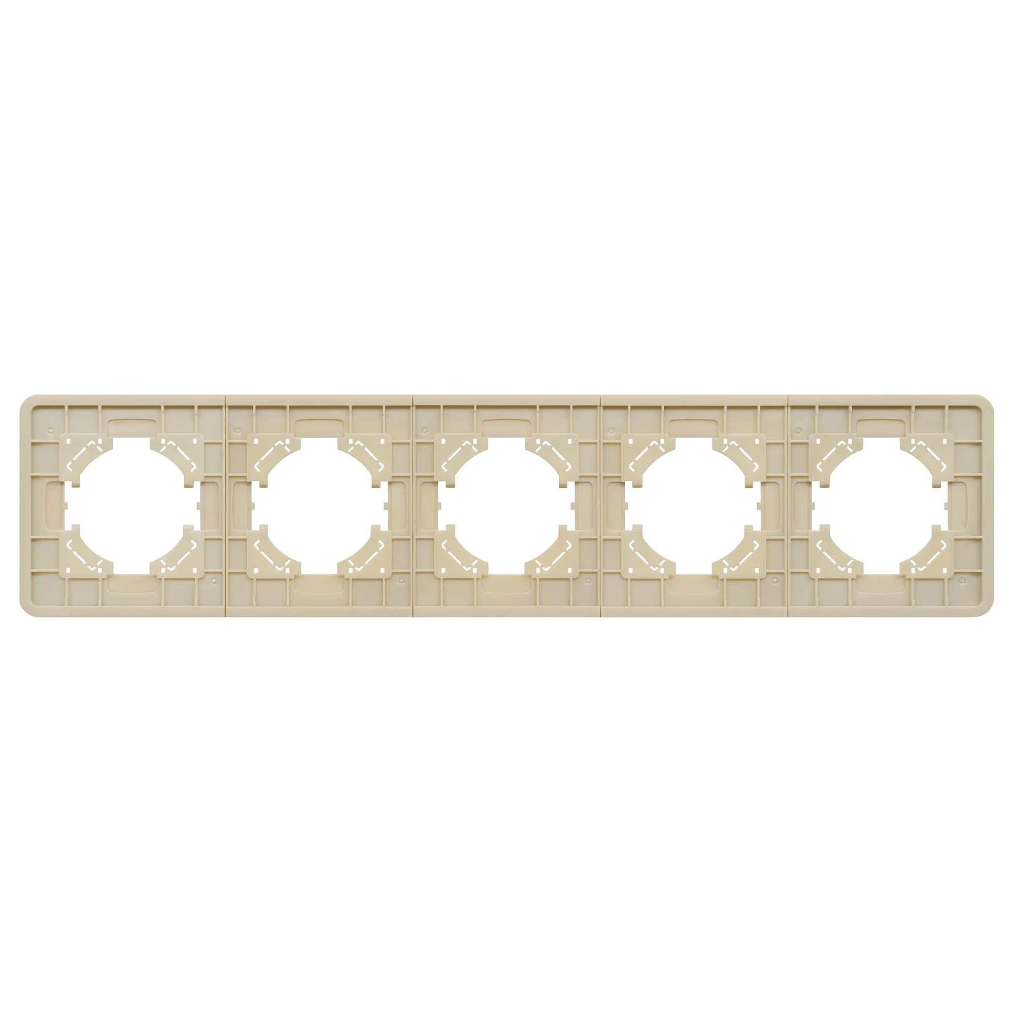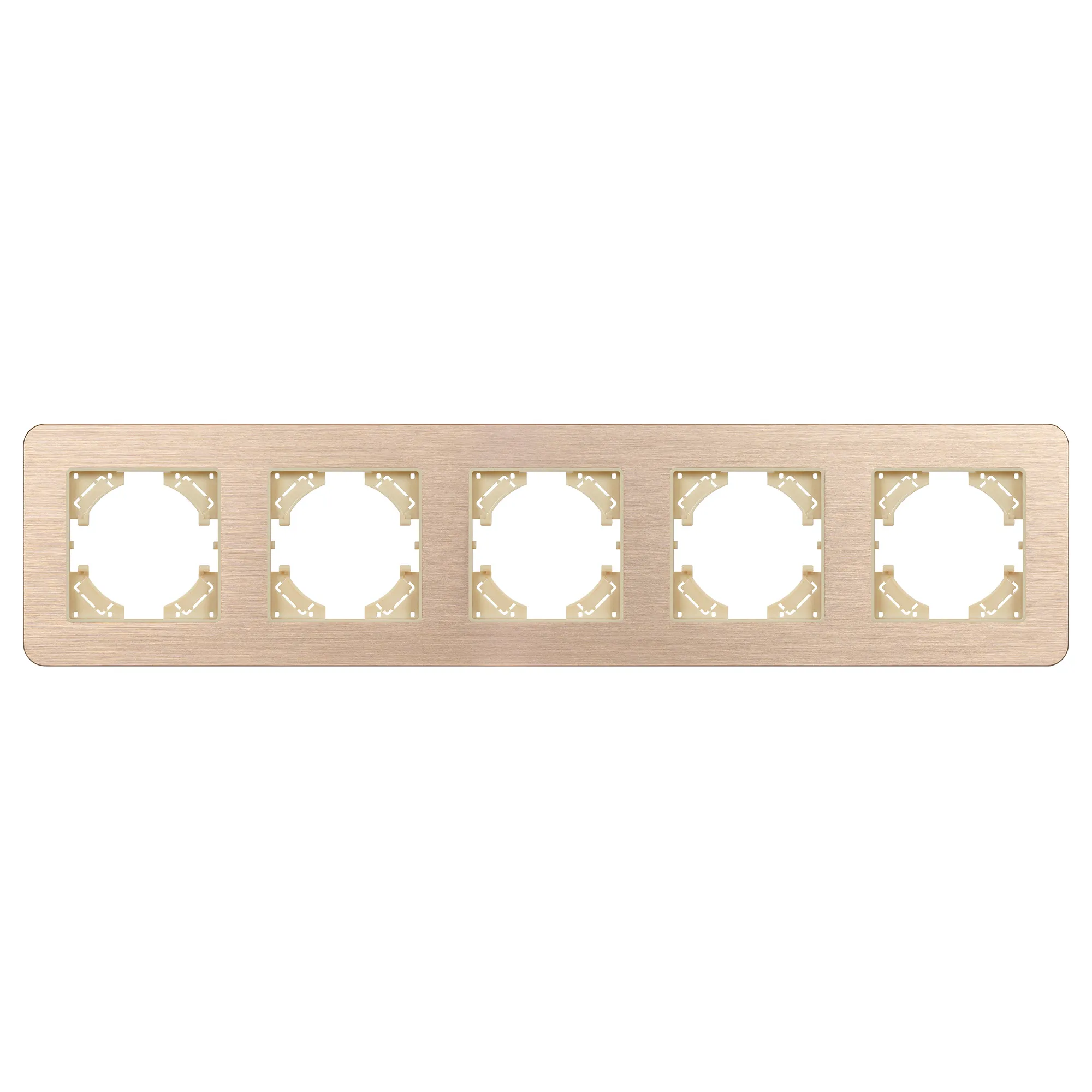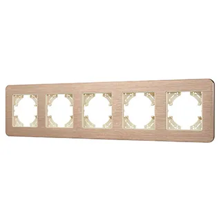 Рамка алюминиевая на 5 постов, под встраиваемый механизм. Цвет - золотой. Среднего уровня герметичности IP20. Ориентация монтажа - горизонтальная (основным ориентиром служат посадочные выступы для накладки механизма).