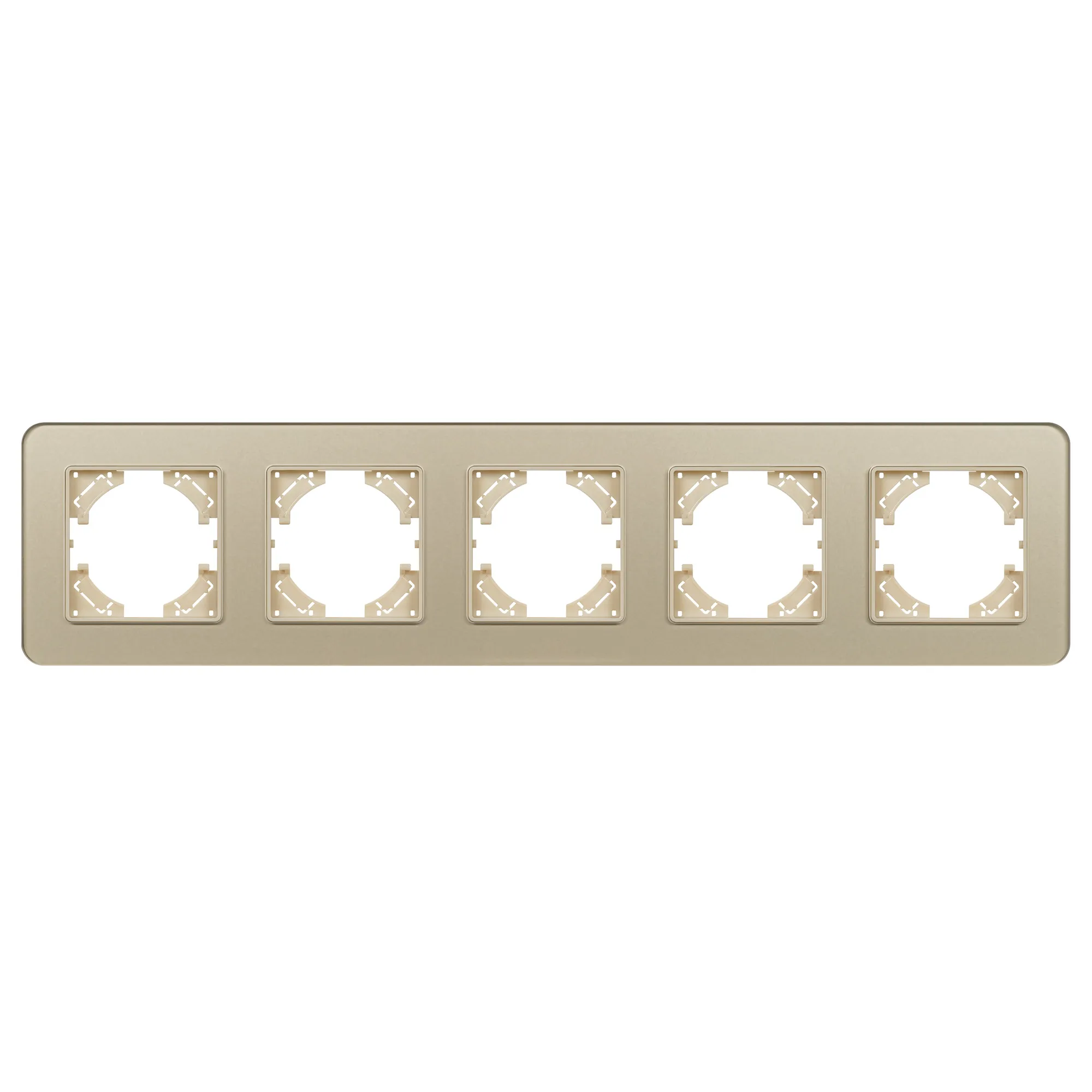Рамка стеклянная на 5 постов, под встраиваемый механизм. Цвет - золотой с Soft-Touch покрытием. Среднего уровня герметичности IP20. Ориентация монтажа - горизонтальная (основным ориентиром служат посадочные выступы для накладки механизма).