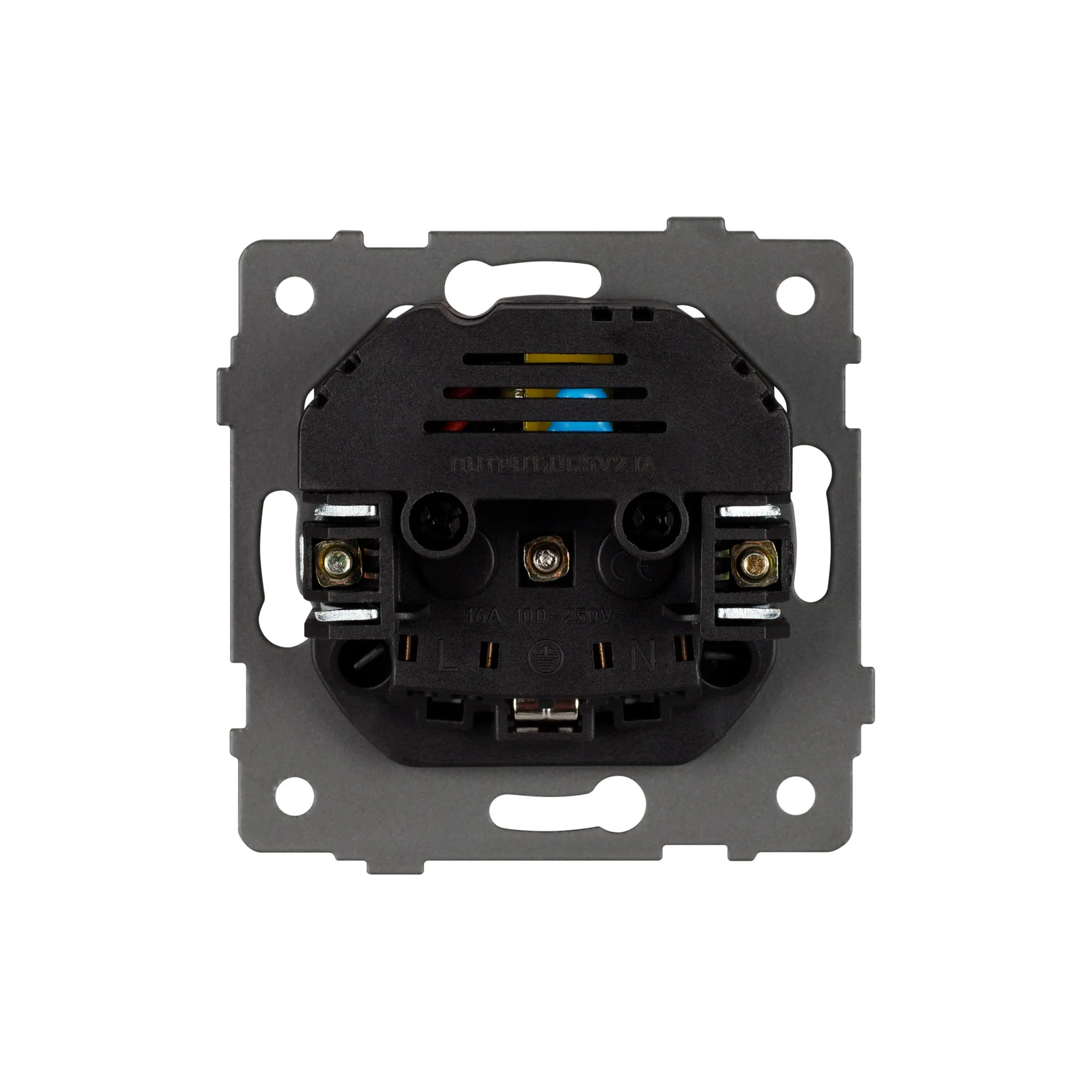 Механизм розетки с заземлением на 1 пост и 2USB Type A порта. Цвет - белый. Без фронтальной рамки. Уровень пылевлагозащиты IP20. Устанавливается в стандартный подрозетник.