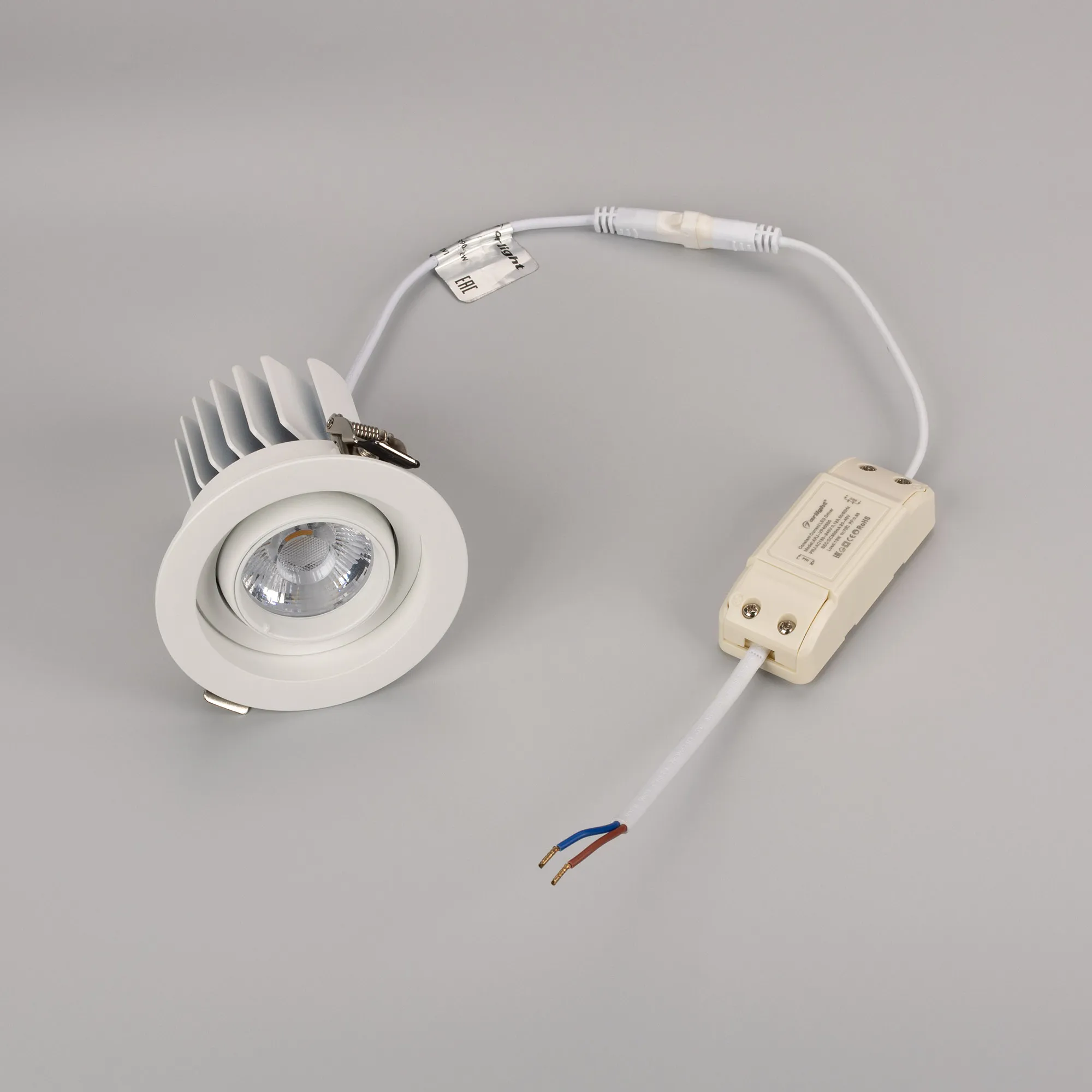лм/Вт, тёплый 3000 K, CRI>92, угол 20°, напряжение питания 230 В. Белый корпус из алюминия, белая вставка, степень защиты IP20. Размер: диаметр 90мм, высота 80 мм. Монтаж встраиваемый, установочное отверстие: диаметр 75мм. Драйвер 27-40 В, 300 мА, пульсация <2%.
