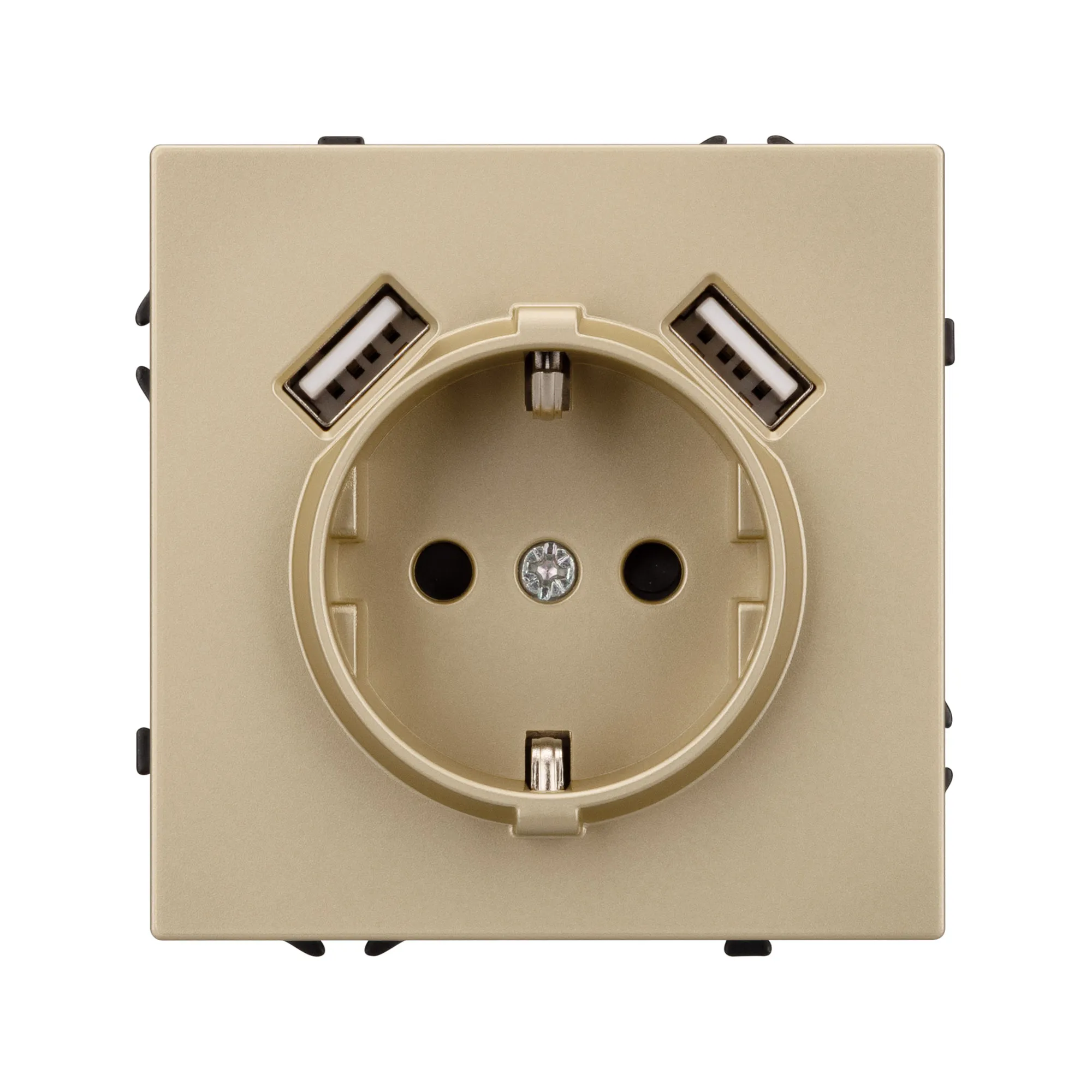 Механизм розетки с заземлением на 1 пост и 2USB Type A порта. Цвет - золотой, с Soft-Touch покрытием. Без фронтальной рамки. Уровень пылевлагозащиты IP20. Розетка устанавливается в стандартный подрозетник круглого сечения диаметром 60мм.