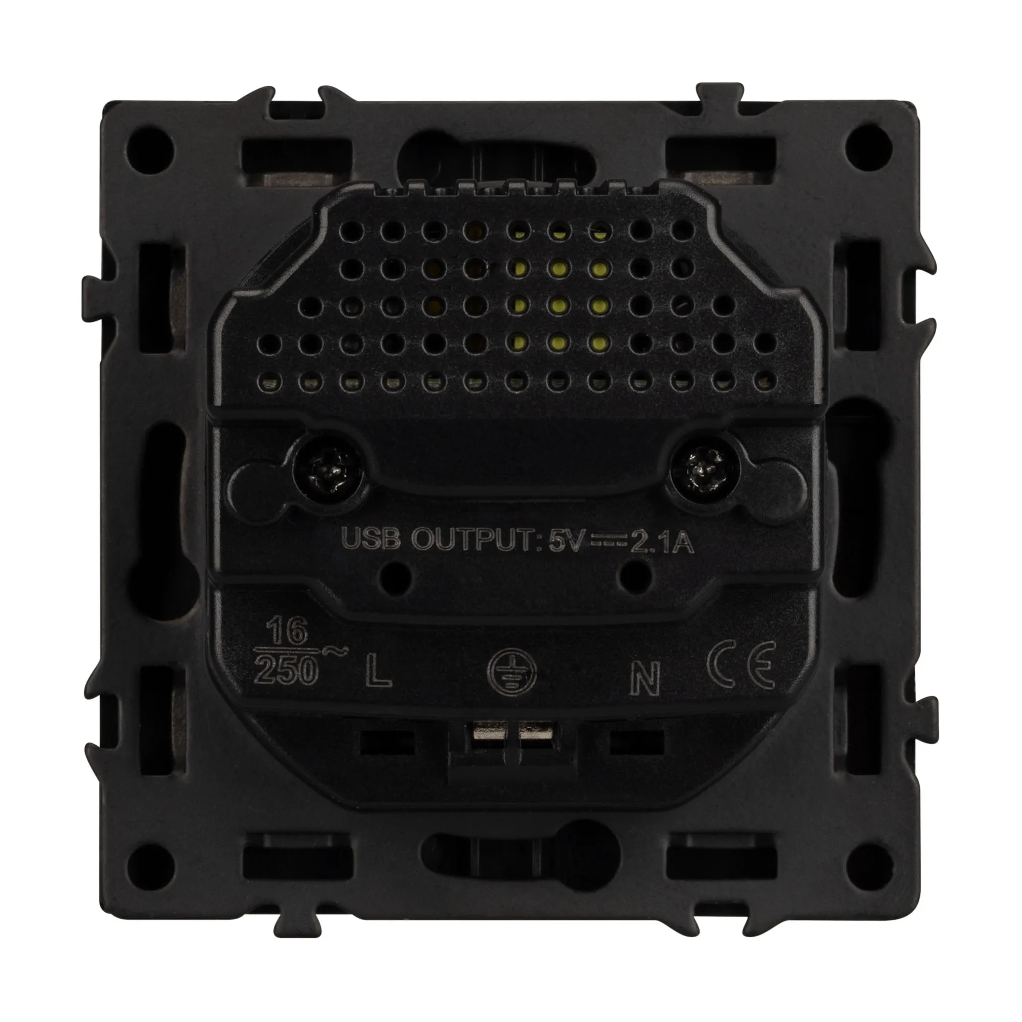 Механизм розетки с заземлением на 1 пост и 2USB Type A порта. Цвет - серый, с Soft-Touch покрытием. Без фронтальной рамки. Уровень пылевлагозащиты IP20. Розетка устанавливается в стандартный подрозетник круглого сечения диаметром 60мм.