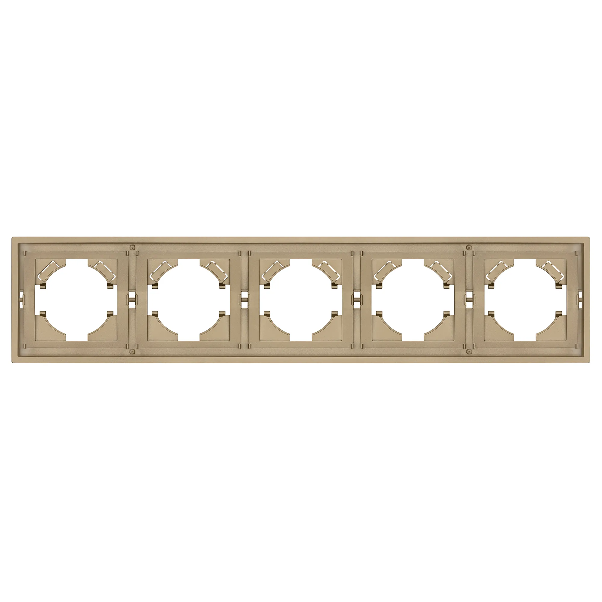 Рамка пластиковая на 5 постов, под встраиваемый механизм. Цвет - золотой, с Soft-Touch покрытием. Среднего уровня герметичности IP20. Ориентация монтажа горизонтальная.