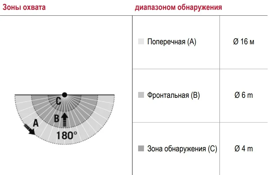 | диапазоном обнаружения Фронтально | Ø 6 м |